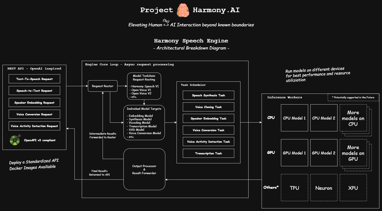 - Harmony Speech Engine, our custom inference engine for AI voice generation, voice cloning and Speech transcription.